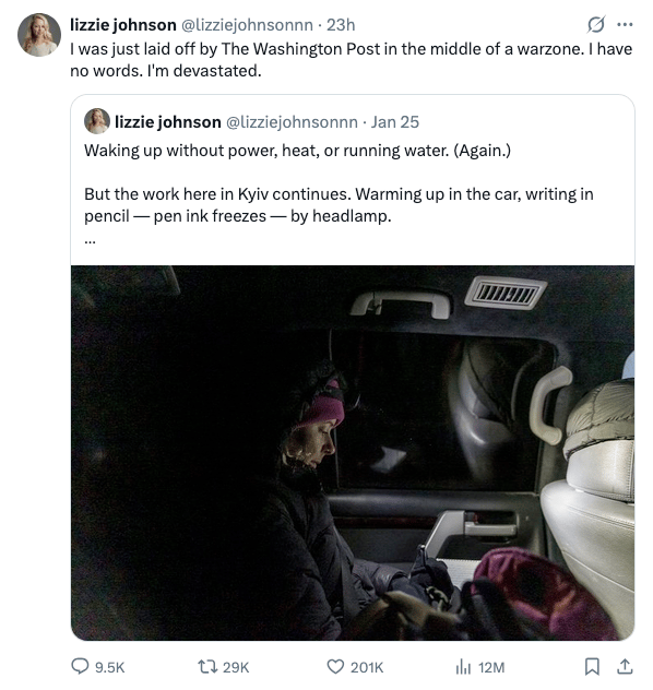 Murray also told employees that their international bureau’s and metro desks were going to get cutback drastically as well. Ukraine correspondent Lizzie Johnson, now formerly of the Post, was let go in the middle of a war zone. She tweeted about it on X, mentioning how she was, naturally, devastated by the news.